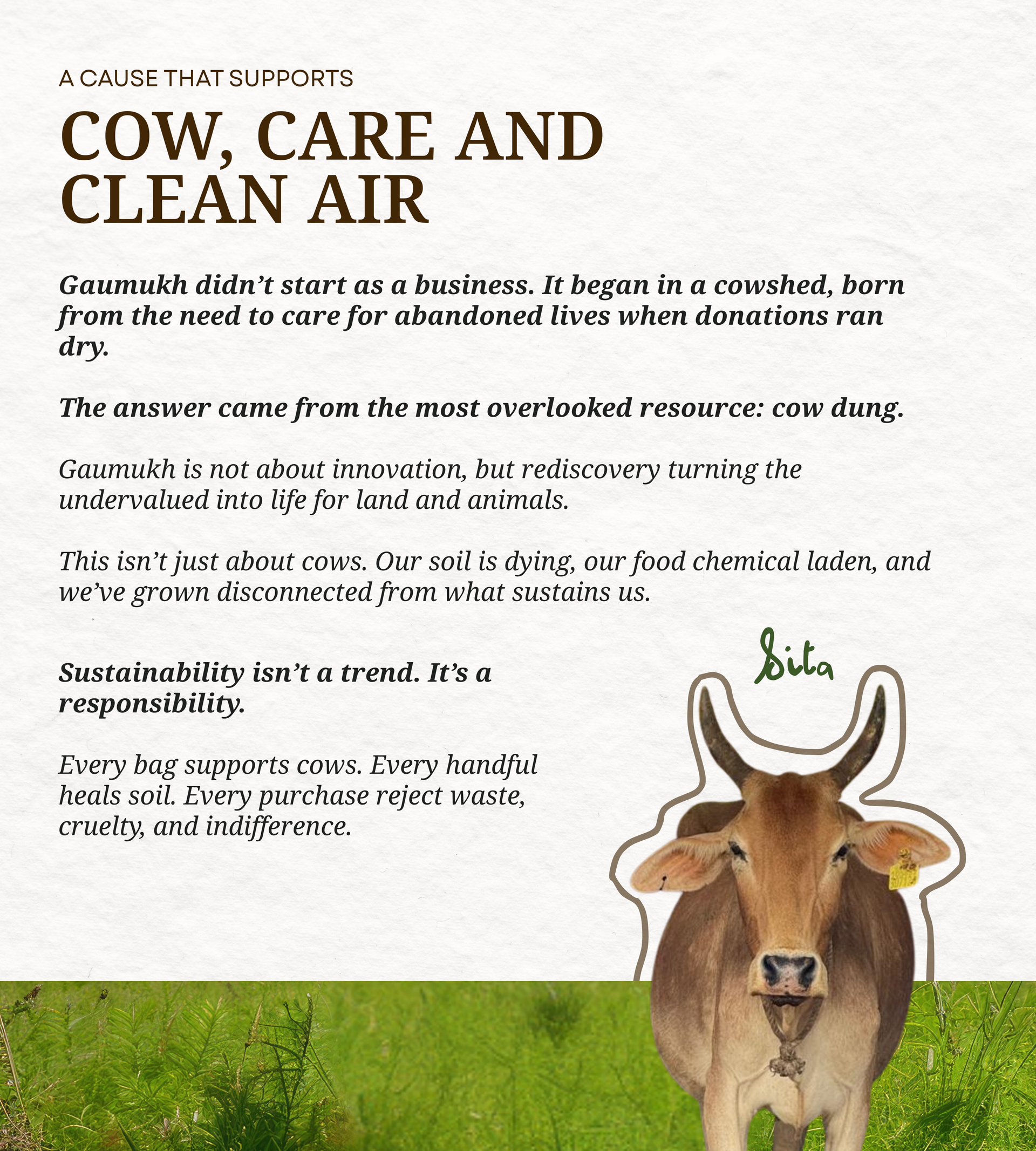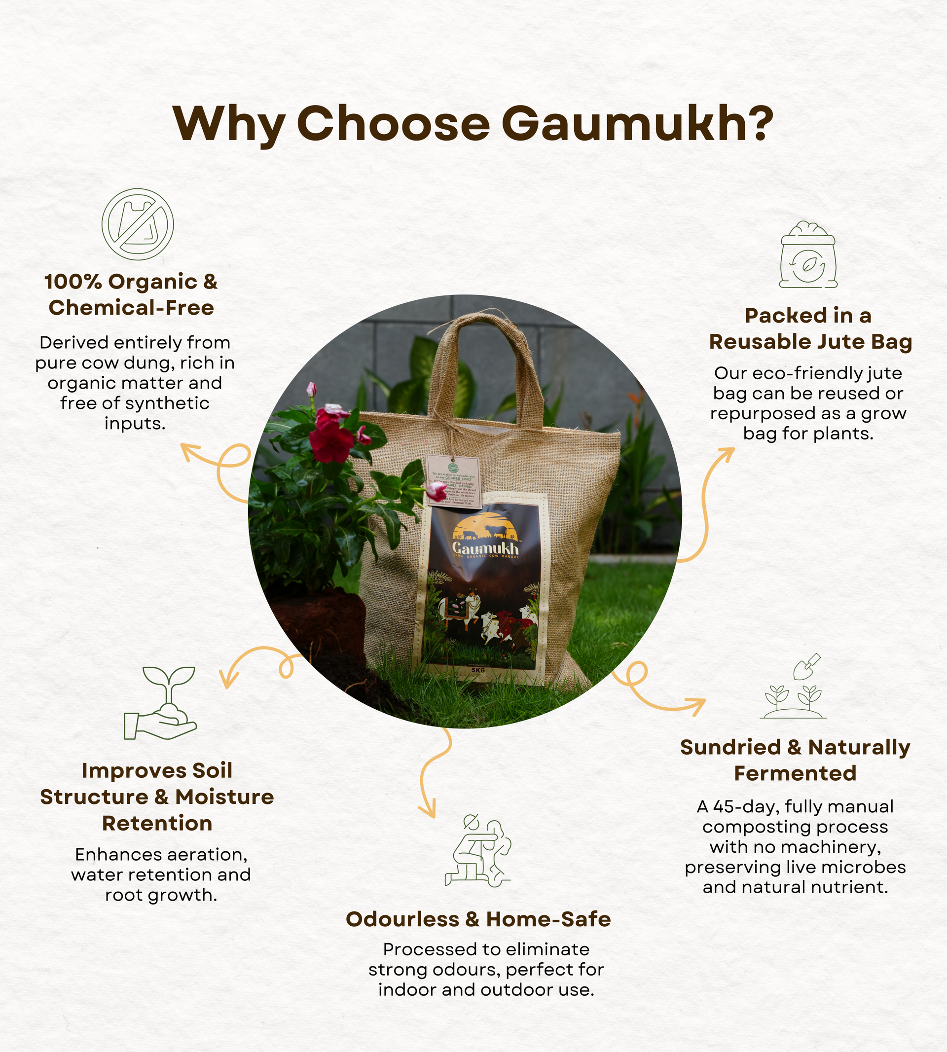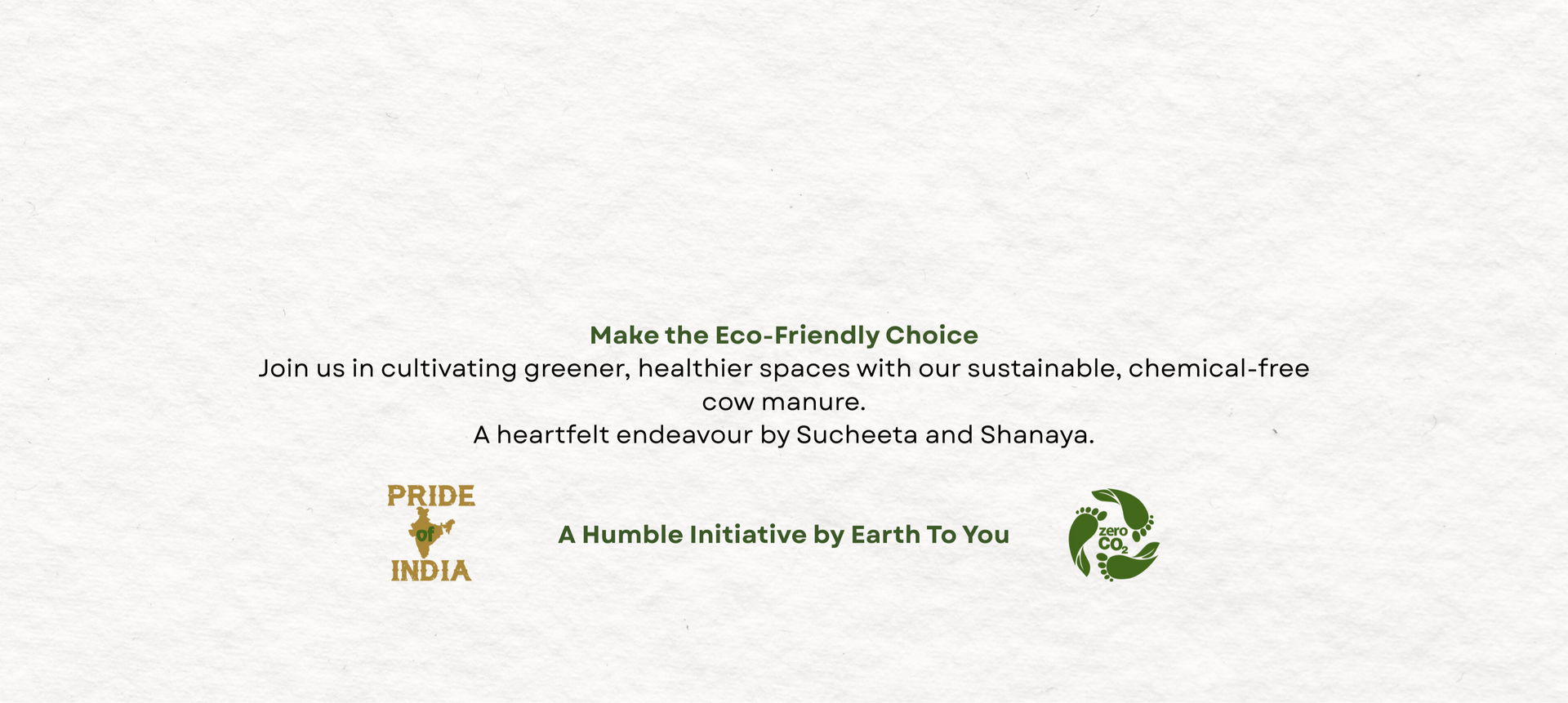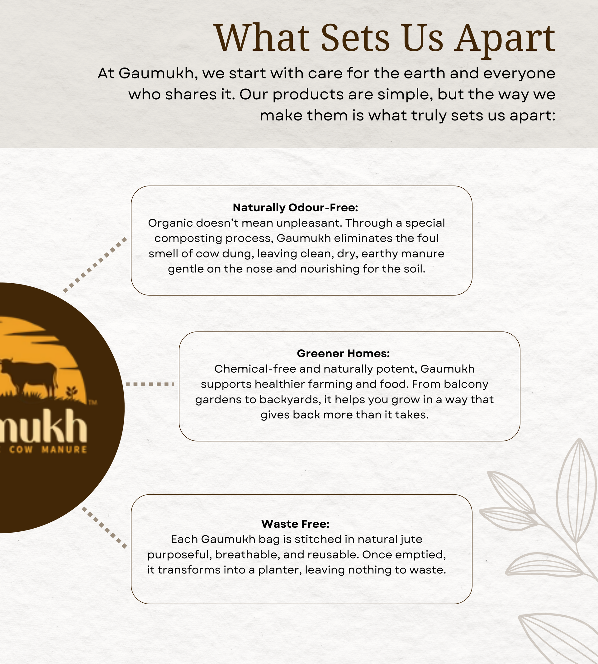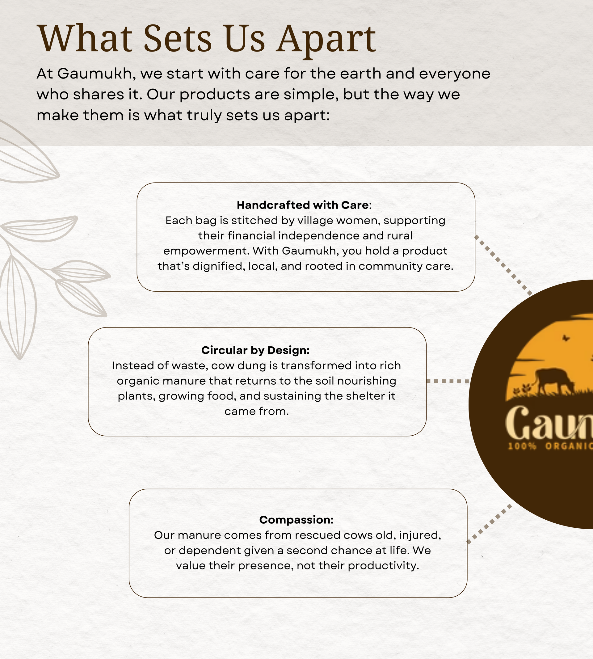 Promotional text for eco-friendly cow manure product with branding on a white background