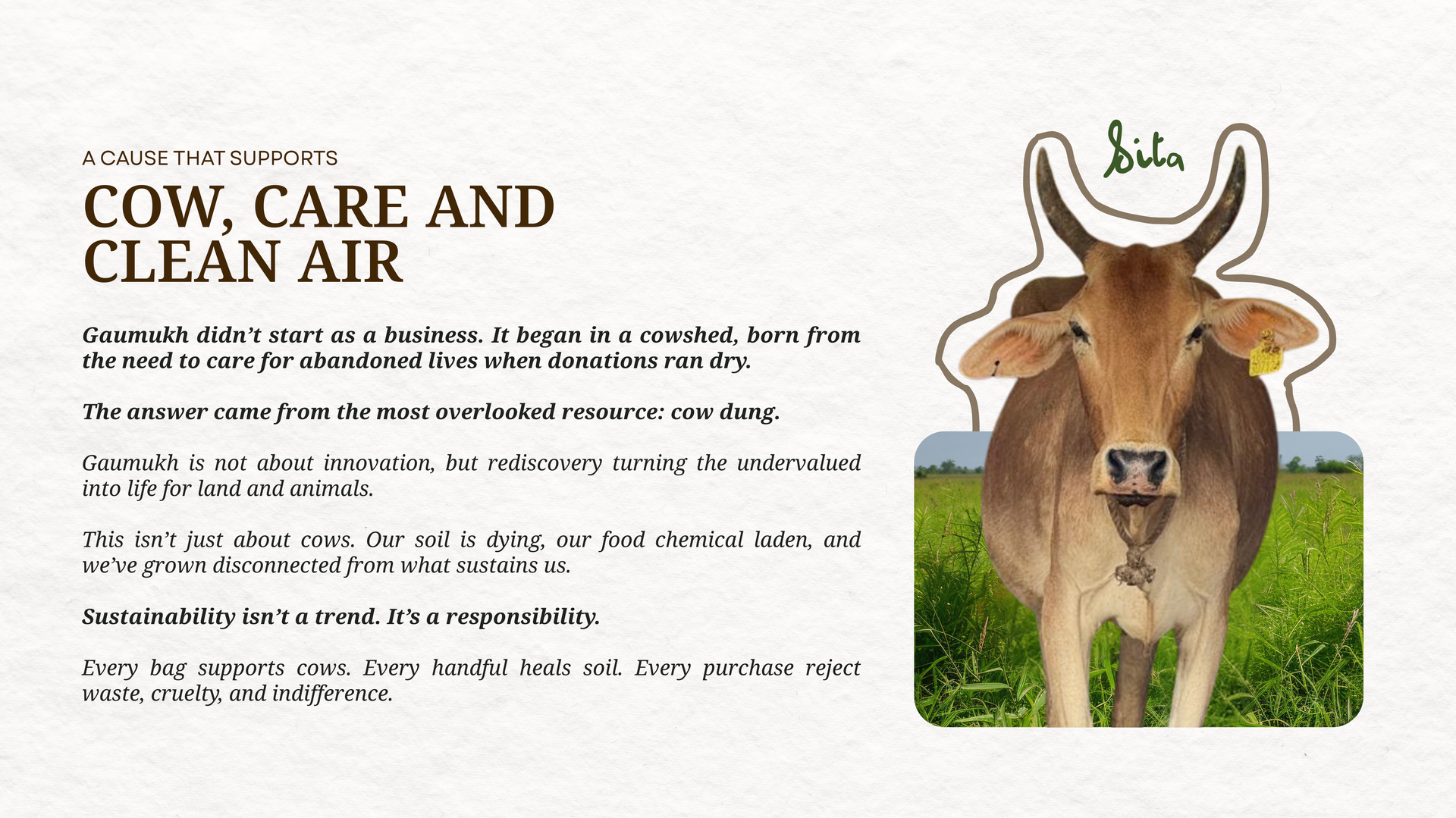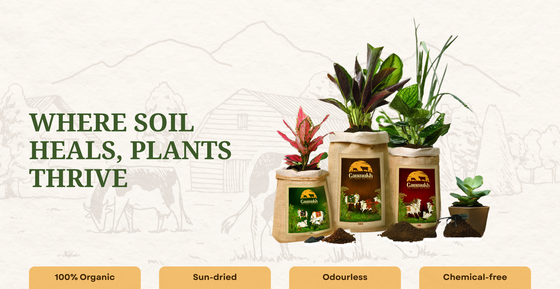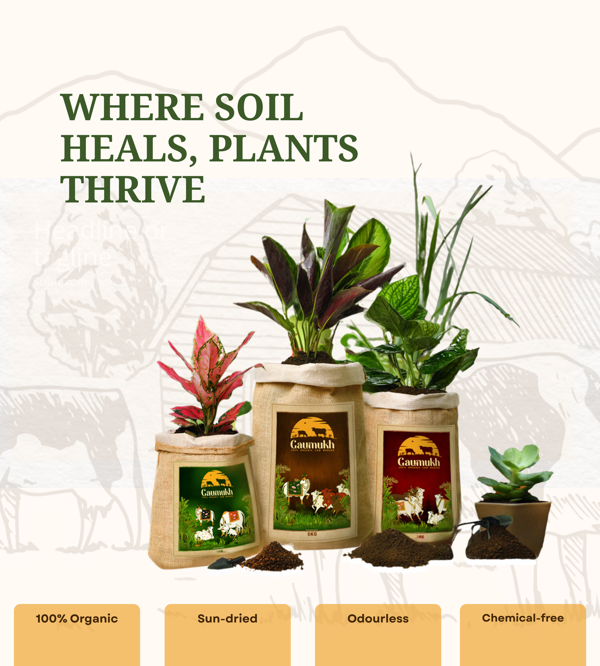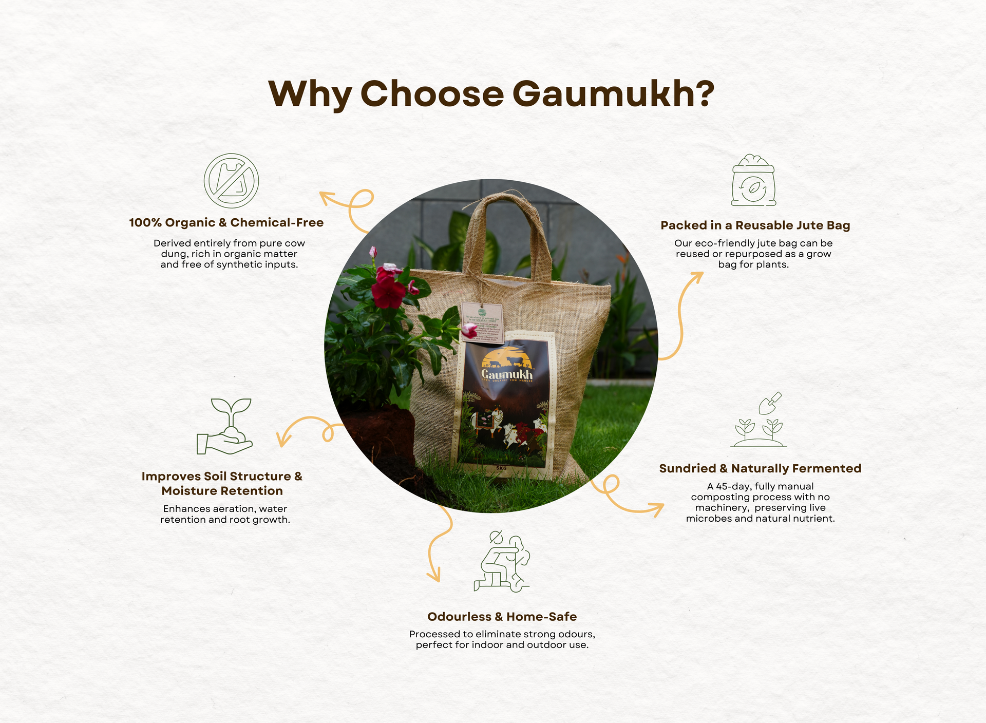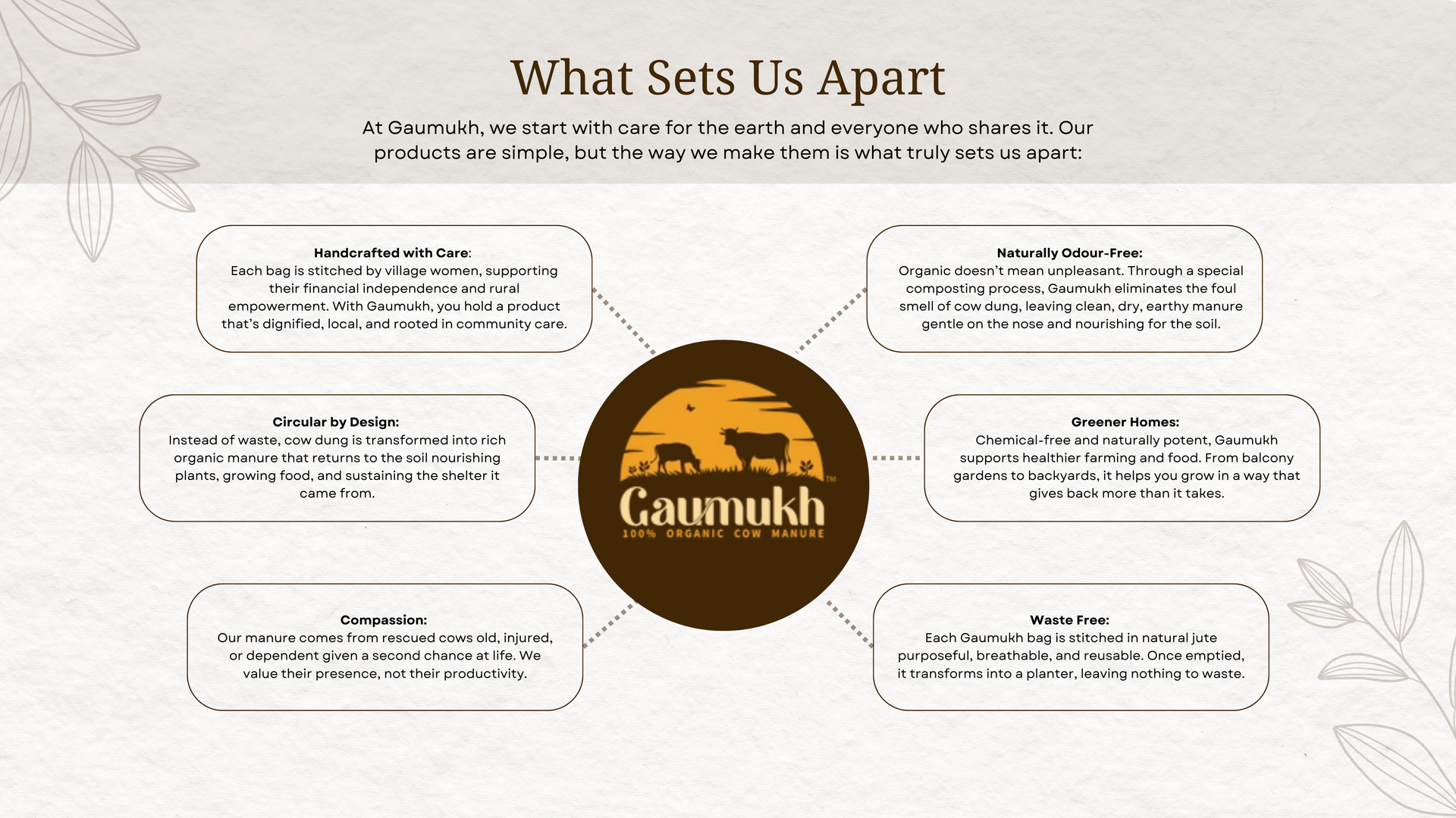 Promotional text for eco-friendly cow manure product with branding on a white background